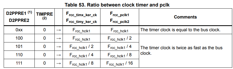 Odd quirk, if the AHB clock is divided by a factor of 2 or more, the timer clock runs at twice the AHB's frequency.