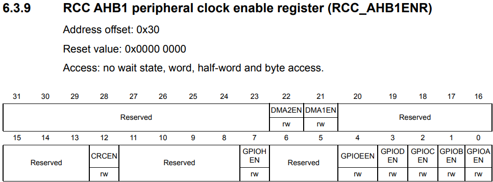 Lo and behold, GPIOAEN (GPIO port A ENable) is what we're looking for to enable the peripheral clock since it's designated as Set and cleared by software, so all we need to do is: