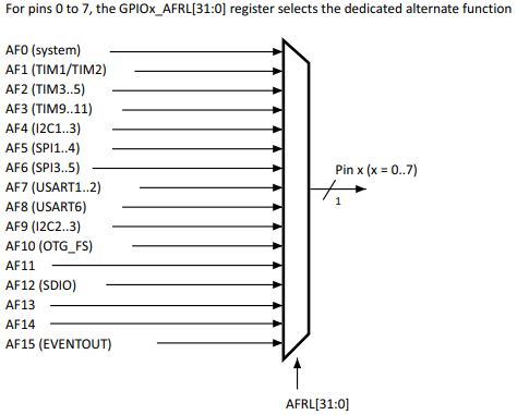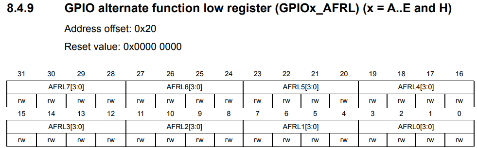 The AFR is split into low/high since each pin uses 4 bits but we have 16 ports, thus needing 64 bits. We can abstract this away with macro magic since they may be inconsequentially regarded as the same. Now, which alternate function specifier do we want?
