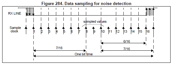 $f_{CK}$ refers to the APB1 clock frequency, and $\text{Baud}$ is our desired baud. $\text{OVER8}$ is 1 if we're using oversampling by 8, otherwise 0 if we're oversampling by 16; this is a parameter which seems to result in better noise detection by sampling the receiving line at higher intervals as shown below: